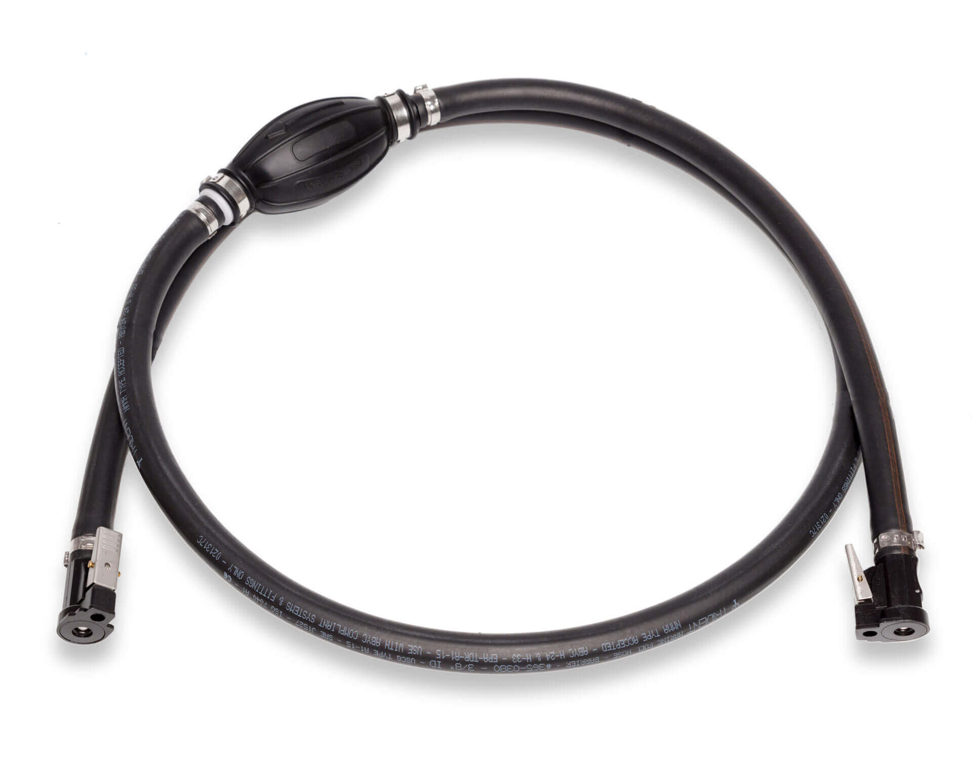 This is a full fuel line assembly that includes our high quality primer bulb, premium A1 hoses and the engine and tank connectors. The fuel line hoses are the standard 18 inches to the tank and 54 inches to the engine. (We can custom make these hoses to any length you(LONGER THAN THE 6′) want and usually in less than 24 hours. Please call 1-877- 786-0606 for more information. ) Pictured below is what a full fuel line assembly looks like.
